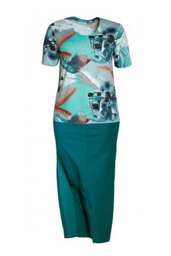 Úpletová halenka rovného střihu s krátkými rukávy a kulatým výstřihem. Rovný střih maskuje rizikovou partii v oblasti pasu a boků.