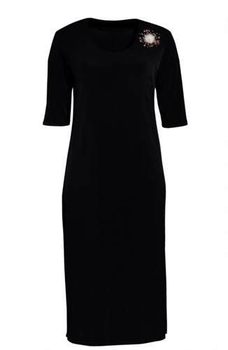 Elegantní šaty pouzdrového střihu tvarované pouze bočními švy. Jediným zdobným prvkem šatů je levostranný boční  rozparek. Šaty jsou s 3/4 rukávem. Chcete-li krátký rukáv, napište si toto prosím do poznámky. Brož není součástí šatů.Vybírejte ze šesti barev a tří délek. Délka 110, 120, 130 . Vybranou délku uvádějte do poznámky.