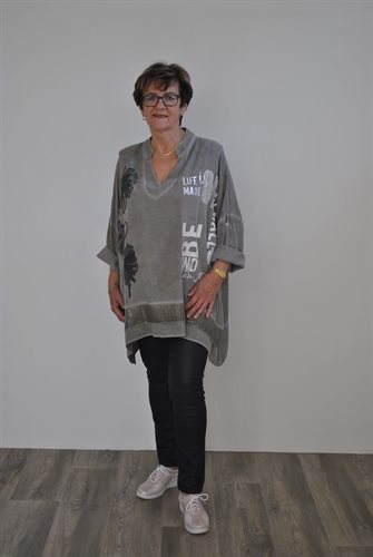 Pohodlná halenka rovného střihu je určena ženám. které mají rády pohodlí, Halenka je ušita z příjemného úpletu. Halenka má dlouhý rukáv, který lze upravit na 3/4 délku. Přední díl je ozdoben květinovou aplikací, stříbrným nápisem a flitrovým páskem ve spodní části halenky.