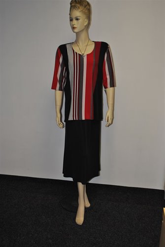 Komplet tvoří třídílnou, jednobarevnou sukní, která je v pase do gumy a délka je 80 cm. Halenka je rovného střihu, 3/4 rukávem a kulatým výstřihem. Zadní díl je z jednobarevné látky. Celková délka halenky je 67 cm. Sukně a halenka jsou ušity z splývavého, nemačkavého úpletu.