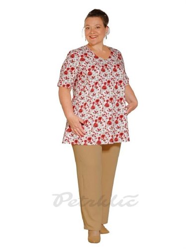Prodlouženou halenku áčkového střihu šijeme v délce 80 a 90 cm s krátkými nebo s ¾ rukávy. Tunika je celovzorová je z příjemného materiálu. Vybranou délku rukávu, tuniky nebo pokud chcete hlubší výstřih, pište do poznámky