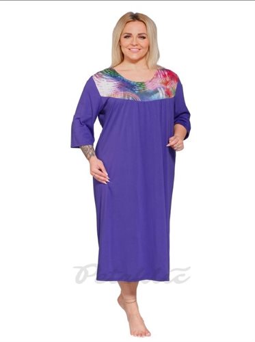 Dámská noční košile nebo také pohodlné domácí šaty. Přední díl je s lehkým řasením všitý do sedla. Zadní díl je v základní barvě, zcela hladký.