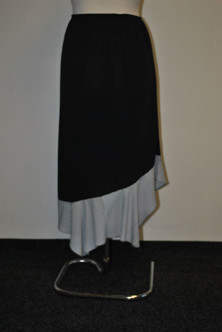 Sukně rovného střihu s ozdobným kanýrem, v pase do pohodlné gumy. Materiál je 100% polyester. Délka sukně 90 cm.