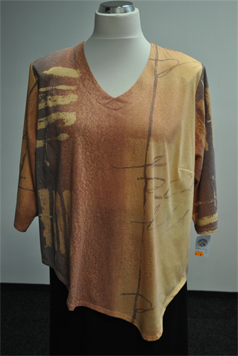 Halenka rovného střihu ze 100% bavlny, přední i zadní díl je asymetrický, 3/4 rukáv, ramenní vycpávky, výstřih do "V". Délka je 70 cm.