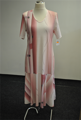 Dlouhé šaty rovného střihu jsou ušity z bavlněného úpletu. Šaty mají krátký rukáv s ramenními vycpávkami, kulatý výstřih a v dolní čati šatů je našit kanýr. Délka 123 cm.