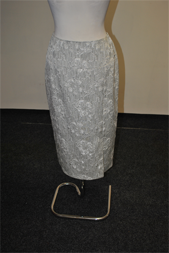 Krásná, společenská sukně, rovného střihu je ušita ze 100% polyesteru. Na předním díle je sedlo a ve členícím švu je rozparek. Na zadním díle je zip, délka sukně je 80 cm.