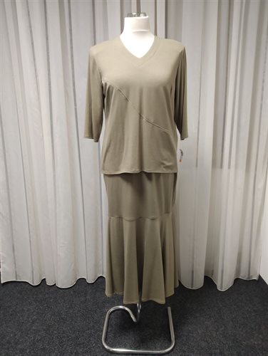 Kostýmková šaty mají sukni rovného střihu, která je v pase všita do pohodlného průvleku s gumou. V dolní části sukně je ozdobný kanýr. Délka je 90 cm. Halenka je též rovného střihu, má 3/4 rukáv, ramenní vycpávky a výstřih do "V". Přední díl je ozdobně sešit ze dvou dílů, délka halenky je 63 cm. Kostým je ušit z příjemného, splývavého materiálu.