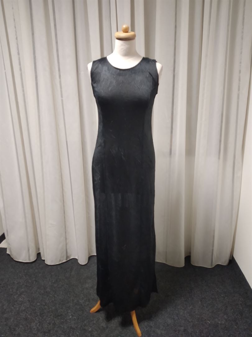 Dlouhé, společenské šaty jsou ušity z průhledného, nemačkavého úpletu. Šaty jsou bez rukávů, mají kulatý výstřih a v bočním švu je hluboký rozparek. Délka šatů je 140 cm.